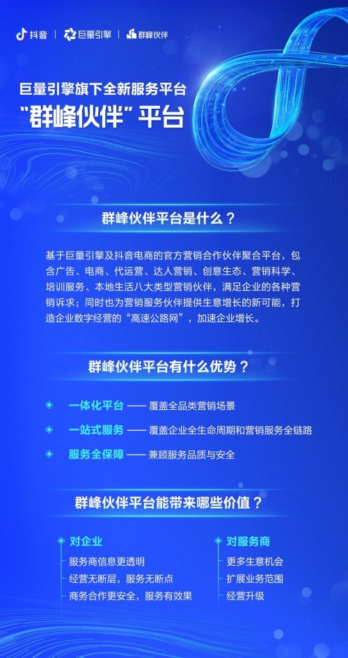 10月28日,2021群峰伙伴生態大會上,巨量引擎推出全新服務平臺“群峰伙伴平臺”。通過群峰伙伴平臺,客戶可以快速、高效且放心的選擇巨量引擎及抖音電商中各類優秀服務商或購買營銷服務產品。