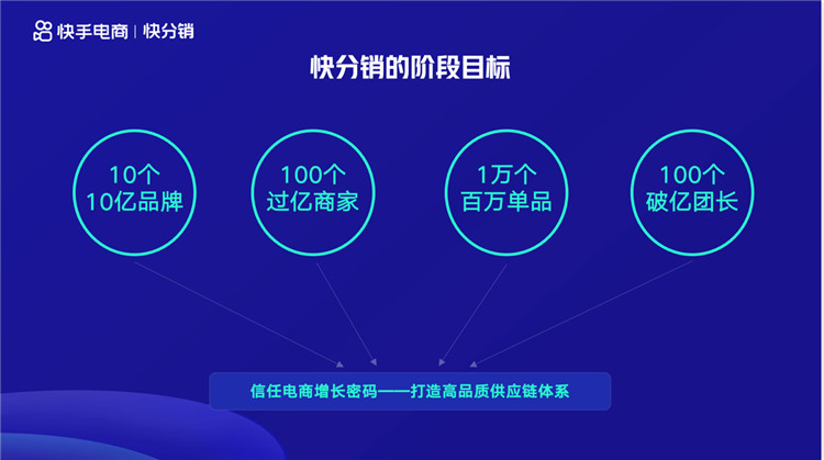 “好物聯盟”業務與三個大搞戰略深度契合。在這樣的背景下,好物聯盟升級為快分銷,成為快手電商一級部門,并把階段目標設定為:打造10個10億+超級品牌,100個過億商家,1萬個爆款百萬單品,100個破億團長,通過高品質供應鏈打造,推動信任電商增長。