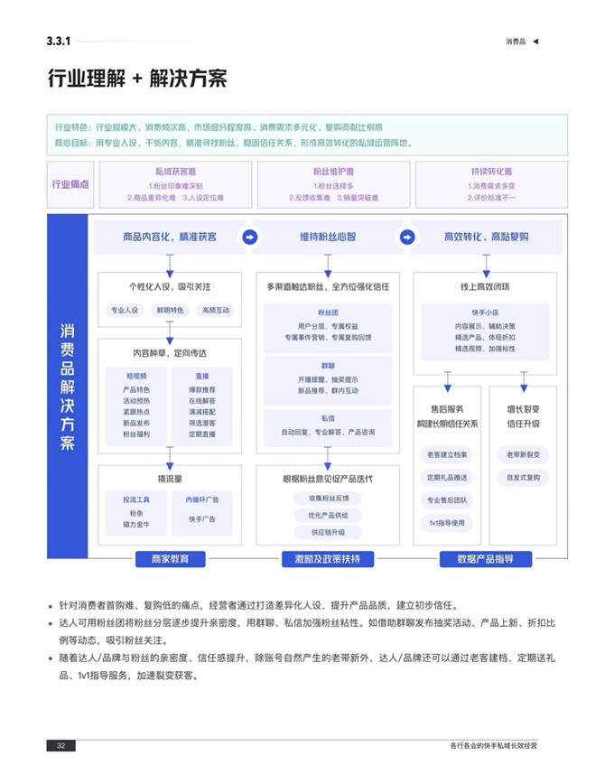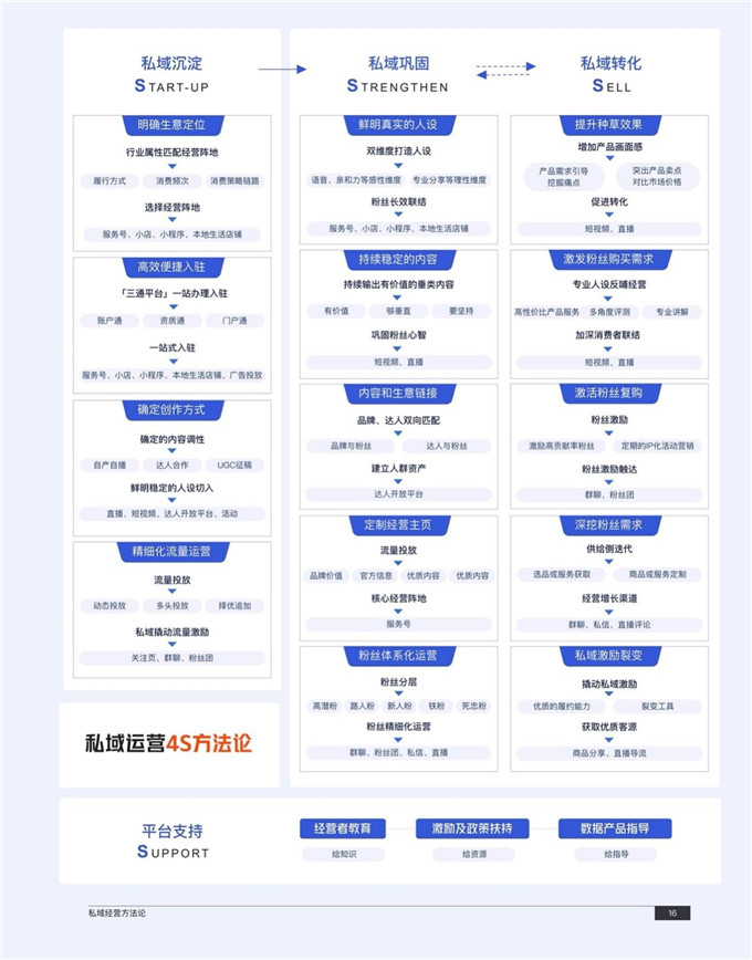 隨著快手私域的擴大發展,商家和達人將如何找到一套完整、系統的運營方法和思路?對此,白皮書整合梳理出了以“私域沉淀——私域鞏固——私域轉化——平臺支撐”為主線的“快手私域經營4S方法論”,為創作者和經營者提供全局經營視野。