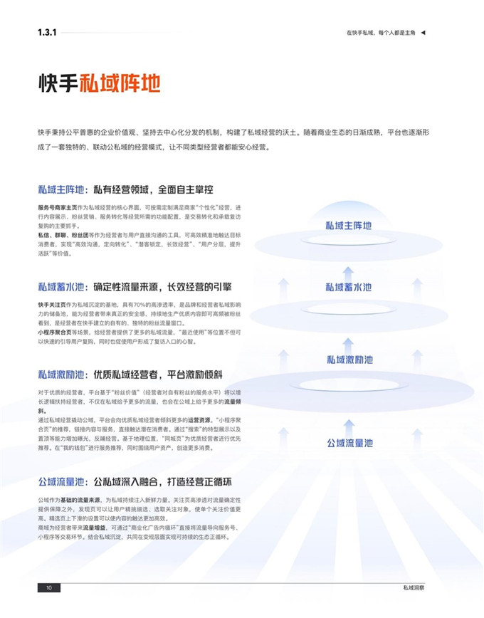 通過“公域流量池——私域激勵池——私域蓄水池——私域主陣地”四步環環相扣,經營者、創作者可以在快手獲得穩定的流量來源,實現高效、精準的粉絲引流、觸達、沉淀與裂變,形成自有的核心用戶圈層,從而形成"信任經濟"高黏性、多復購、可持續的社交資產和長期交易閉環。
