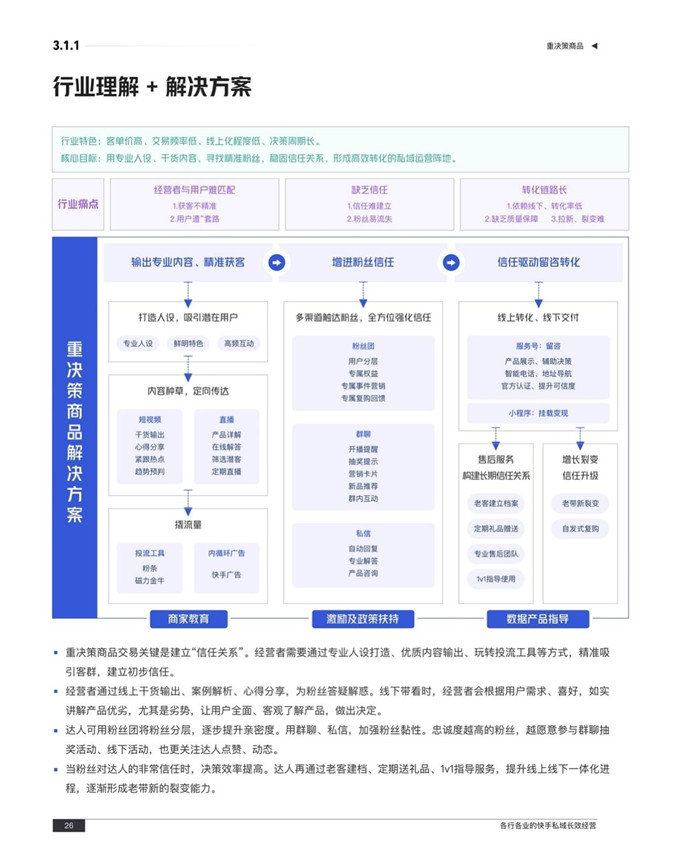 針對重決策商品領域經營者與用戶之間難以匹配、缺乏信任、轉化鏈路長等痛點,白皮書提到,重決策商品交易關鍵是建立"信任關系",經營者和創作者需要通過專業人設打造、優質內容輸出、玩轉投流工具等方式,精準吸引客群,再通過老客建檔、定期送禮品、1v1指導服務等形式提升線上線下一體化進程,逐漸形成裂變能力。