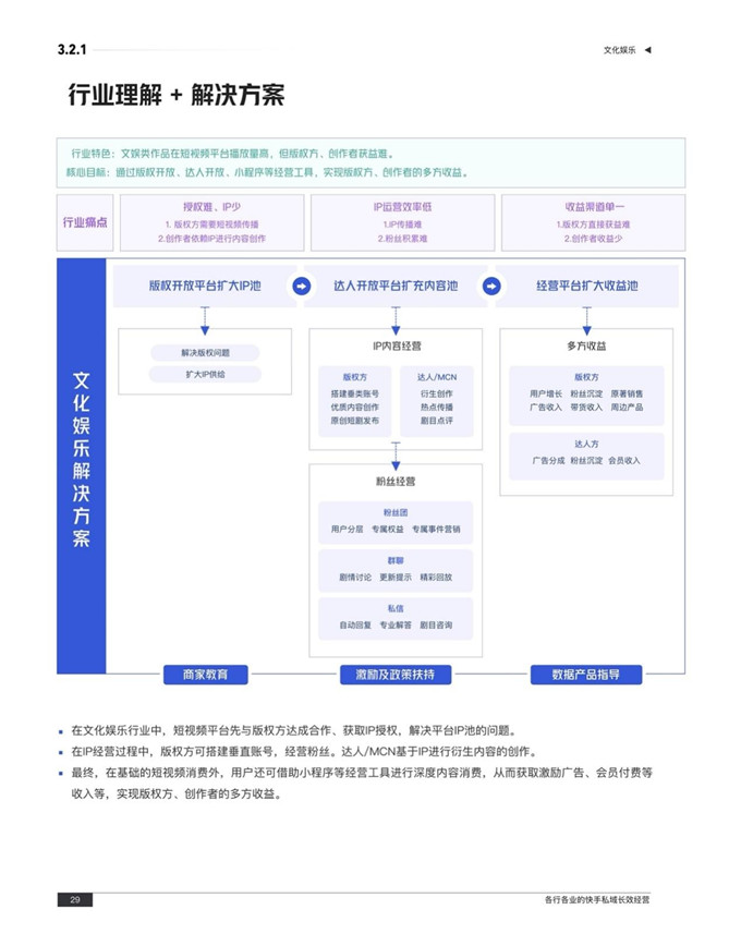 針對文娛類領域授權困難、IP少、運營效率低、收益渠道單一等痛點,白皮書認為,可通過平臺與與版權方達成合作、獲取IP授權,邀請版權方搭建垂直賬號等形式解決IP問題,最終,在基礎的短視頻消費外,用戶還可借助小程序等經營工具進行深度內容消費,從而獲取激勵廣告、會員付費等收入,實現版權方、創作者的多方收益。