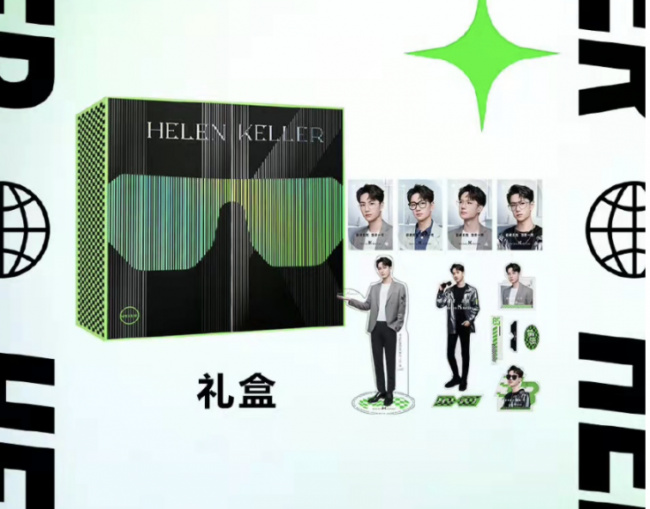 官宣當天,海倫凱勒便同步上線了代言人同款禮盒。禮盒以王一博應援色綠色為主色調,內含代言人同款眼鏡和人形立牌、海報、明信片等周邊,立刻撬動粉絲購買、傳播熱情。
