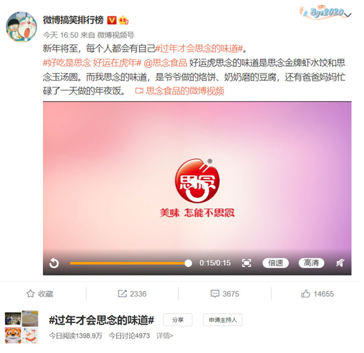 為配合TVC擴散,思念食品聯合榜姐打造了走心話題——#過年才會思念的味道#。廣大用戶在春節情緒的調動下,自發參與話題討論并留言傾訴了自己思念的味道。爆發當日,微博端話題#過年才會思念的味道#話題閱讀量達1398W+,思念食品巧妙借助“思念的味道”撩撥了用戶思念情緒,在新年之際引起了新一輪的思念風潮。