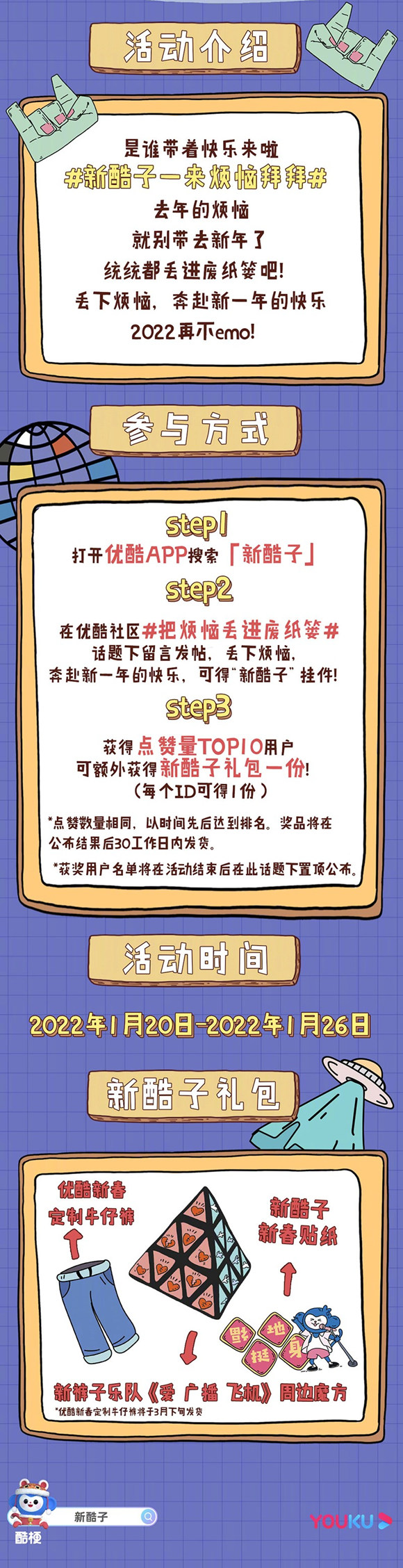 為將「掃除煩惱」的目標落到實處,在內容之外,優酷還以社區平臺酷梗進行承接,發起「把煩惱丟進廢紙簍」的號召,邀請年輕用戶分享生活的苦惱,讓那些積攢已久、難以對身邊人開口的困擾,通過傾訴得到紓解。在社區中,用戶也可以從與其他人的交流中,找到互相理解的共鳴。優酷還為部分參與活動的用戶送上有趣而治愈的「新酷子禮包」,幫助他們與煩惱徹底告別。