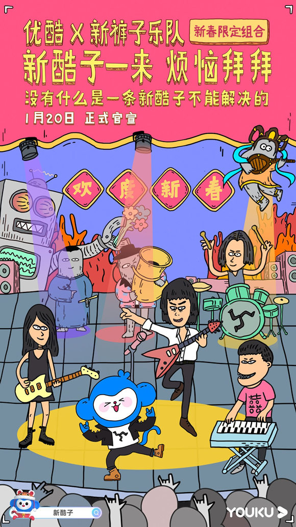 隨著春節逐步臨近,品牌們紛紛發布賀歲大片,忙于展開溫情暖心的情感溝通,優酷卻另辟蹊徑,與新褲子樂隊組起了跨界 CP,以「新酷子」之名強勢「出道」,實現了傳說中的雙「褲」合體。這支自帶話題的新春限定組合,繞開了傳統的團圓主題,抓住年輕人們的「年末焦慮癥」,為他們帶來了一臺告別煩擾的春節預熱節目。