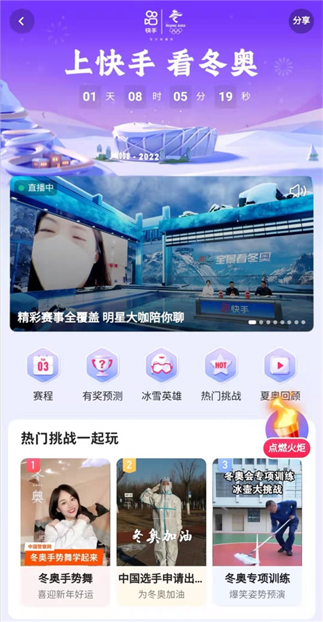 2021東京奧運會期間,快手就已經充分發揮了短視頻與直播的強互動優勢。數據顯示,平臺奧運相關作品及話題視頻總播放量達730億次,端內總互動人數達60.6億。而在北京2022年冬運會期間,快手在延續東京奧運會全場次賽事點播基礎上,繼續為觀眾帶來更多觀賽方式和樂趣體驗。