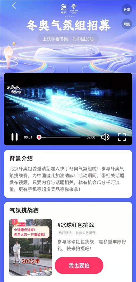 為了在奧運期間更好地助推全民冬奧氛圍,快手還充分利用平臺自身達人資源,調動政務、媒體等機構、以及40個以上的垂直門類達人、以不同角度、更多樣的特色內容展現、記錄冬奧精彩內容。值得一提的是,快手在站內發起的“冬奧氣氛組招募”活動,網友自發跳起“冬奧加油手勢舞”,玩起“冰球紅包挑戰”,截至目前,相關話題下,短視頻作品總量已經超過1萬個,累計播放量達8.5億,許多快手達人各顯神通,用特色方式表達對北京冬奧的美好祝愿。