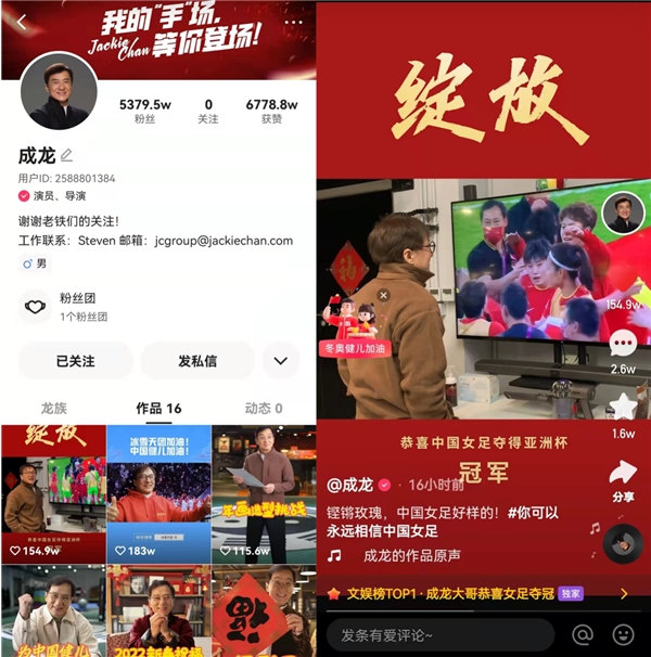 而在喜劇之外,來自不同領域的更多明星融入了快手社區中。周杰倫、楊冪、迪麗熱巴、陳坤等頭部明星先后入駐快手,分別覆蓋不同的用戶并實現內容的擴容和升級。去年10月,成龍入駐快手,發布的第一條短視頻不到10小時播放量就破億,近日發布的祝賀女足奪冠視頻快速登頂文娛榜TOP1。