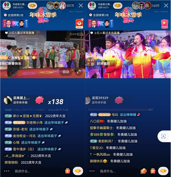 2月5日大年初五晚,快手聯合劉老根大舞臺打造的冰雪運動題材聯歡活動《年味冰雪季》在“劉老根大舞臺”快手官方賬號播出,劉老根大舞臺全員齊上陣,以趣味競技助力冬奧,用特色才藝陪大家過年。精彩節目吸引了眾多用戶積極觀看和參與互動,直播間累計觀看人數達1.5億,最高同時在線人數達362萬。