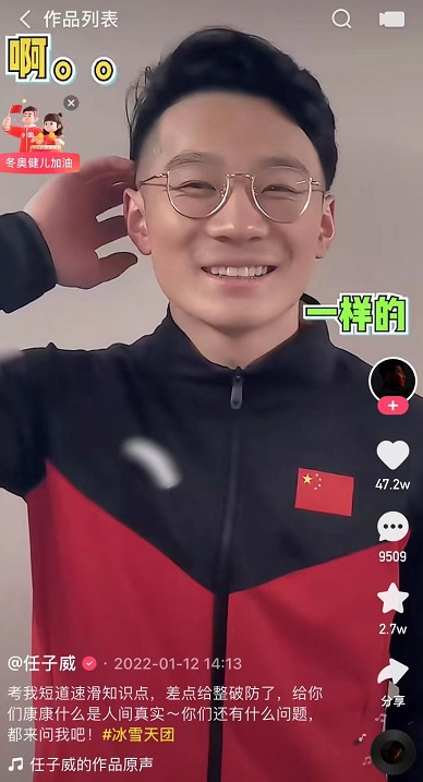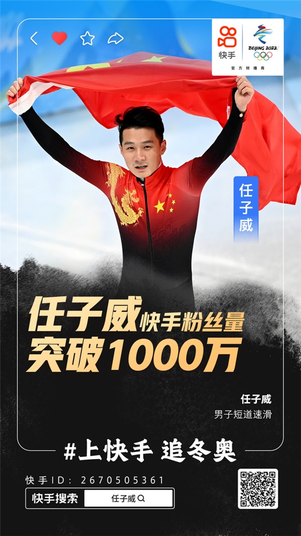 出色的表現,傲人的成績,也讓任子威成為本屆冬奧會最為耀眼的運動員之一。自冬奧會開幕以來,任子威的快手賬號粉絲量已突破千萬,單條短視頻播放量超5000萬次,任子威相關話題更是登上快手熱榜90余次,“任子威加油“、“任子威偷偷收集了好多冰墩墩“、“任子威激動落淚”、“任子威一人參加五項比賽”等話題在快手熱榜高居不下。