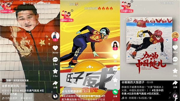 眾多快手用戶也用自己的方式表達對任子威的喜愛??焓钟脩鬇多米諾冷風耗時10小時,擺1萬張撲克牌祝賀任子威奪冠;@畫畫的大飯團子用油畫棒復原任子威奪冠瞬間….顯然,來快手為任子威加油,已經成觀眾們為為北京冬奧會打call的新潮流。