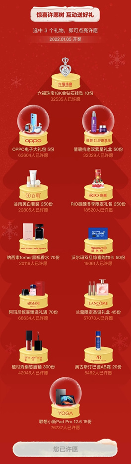 在“雙旦”這一營銷節點,小紅書聯合快消、數碼、美妝、飲料、珠寶5大行業的六福珠寶、OPPO、倩碧Clinique、谷雨、RIO微醺、納西索 羅德里格斯香氛、沃爾瑪、阿瑪尼美妝 Armani Beauty、蘭蔻LANCOME、植村秀中國、Augustinus Bader、聯想YOGA共12家品牌啟動“驚喜雙旦狂歡季”,不僅邀請明星、頭部KOL集中造勢,加碼站內外各項曝光資源,還推出“驚喜許愿樹”活動:用戶可以任意選擇3個品牌禮盒作為心愿,通過抽獎機制免費獲得新年禮物,活動期間,用戶如果完成瀏覽相關筆記、關注品牌賬號等任務,還能提高心愿實現的機率。