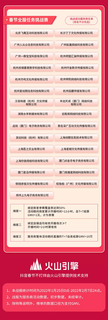 近日,抖音電商服務商團隊于2022年1月25日-2022年2月7日為服務商打造的專屬活動——【服務商虎年新春爭霸賽】,圓滿收官。
