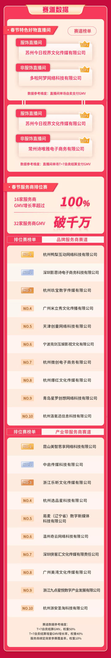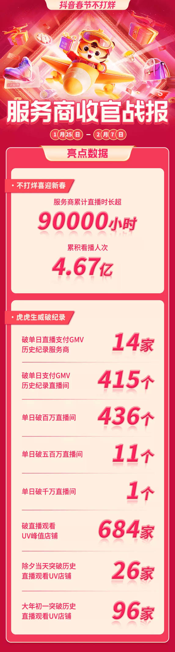 活動戰報顯示,此次春節不打烊期間服務商側累計直播時長超90000小時,累計看播4.67億人次。服務商虎年新春爭霸賽活動中,破單日直播支付GMV歷史紀錄服務商14家,破單日支付GMV歷史紀錄直播間415個,單日破百萬直播間436個,單日破五百萬直播間11個,單日破千萬直播間1個,684家店鋪破直播觀看UV峰值,26家店鋪除夕當天突破歷史直播觀看UV,96家店鋪大年初一突破歷史直播觀看UV。