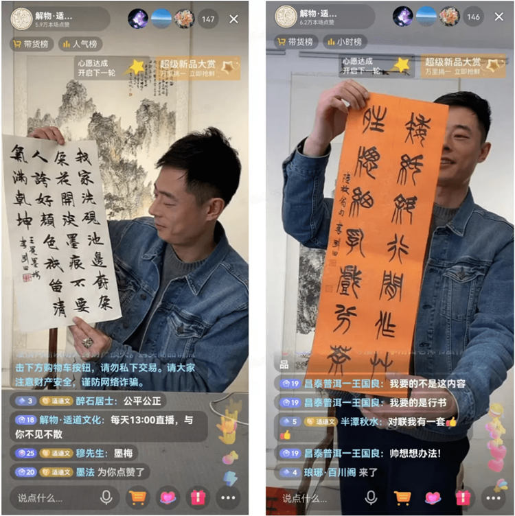 春節期間商品如何布局優化?區別于名家篆刻作品、字畫周邊等日常商品,春節期間,昆山美智為適道文化的直播間,準備了名師作畫和祝福書法等節日特殊商品,還邀請8位名家書法老師做客直播間進行賀新年,送福字。通過排品優化,新增更契合過年氛圍的名師作畫、祝福書法,以及現場創作送粉絲福利,適道文化春節期間GMV環比增長25.79%,創造單場GMV新記錄73萬+,首次月GMV破千萬。
