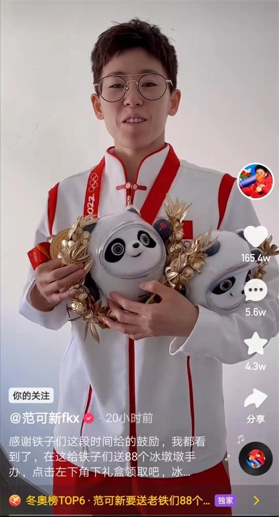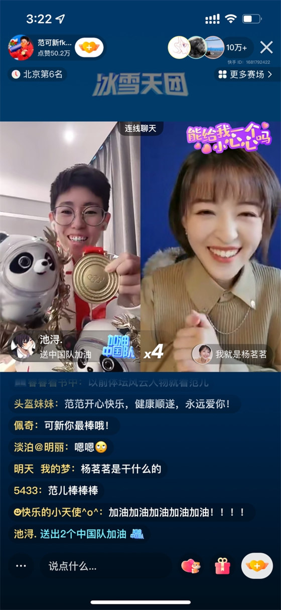 直播中,快手用戶紛紛發(fā)送評論互動,表達(dá)自己對范可新的喜愛和對中國女子短道速滑隊的支持。為了回饋大家的喜愛與支持,范可新表示將繼續(xù)在快手上分享自己的訓(xùn)練和生活日常,此外,也參與了由快手平臺發(fā)起的“冬奧冰雪天團(tuán)包墩到戶”抽獎活動,為粉絲送出88個冰墩墩。
