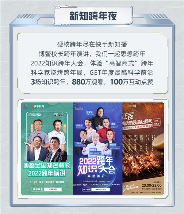 新年期間,快手新知播共組織了3場知識跨年——博鰲校長跨年演講、2022知識跨年大會、科學家燒烤跨年局。“高智商”跨年方式吸引了880萬人在線觀看,并以年度最酷科學前沿收獲了100萬互動點贊。