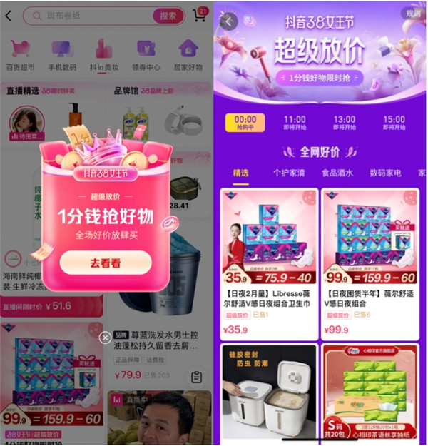 在傳統線下零售場景中,38節營銷節點本就是女性護理品牌的必爭之地,本次「抖音38節」個護家清鮮花行業也將女性護理品類作為重點扶持對象,從貨品、流量等維度予以扶持,不僅結合抖音電商興趣好物特點,推出平臺專屬組合貨品;還延長品牌旗艦店自播時間,增加福袋、秒殺等互動玩法,著力提升直播間互動及轉化。
