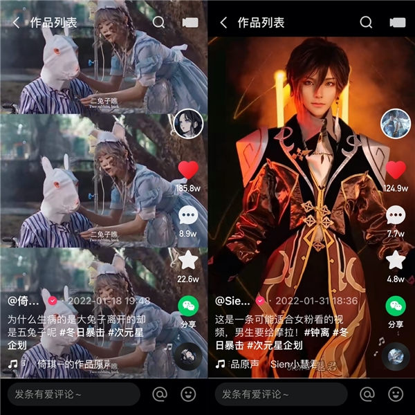 在活動熱度加持下,眾多二次元達人產出了許多爆款視頻?!耙戌?”在其活動作品之一“十只兔子”中,以精美造型演繹多層次故事情節,單條視頻播放量高達8500萬;COS達人“Sien小慧君”為回饋女粉,反串cos王者榮耀角色鐘離,單個視頻播放超4700萬......優質內容吸引眾多泛二次元圈層用戶,讓二次元達人們成功火出圈。