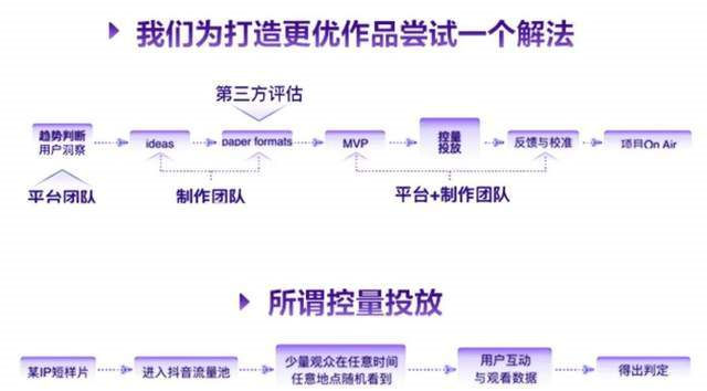 創(chuàng)新內(nèi)容制作環(huán)節(jié)的綜藝則是指獨(dú)創(chuàng)IP《百川綜藝季》,抖音綜藝將聯(lián)合國內(nèi)27個(gè)綜藝制作團(tuán)隊(duì)打造出6檔綜藝節(jié)目,整個(gè)制作環(huán)節(jié)將嘗試一種全新的“控量投放”模式——通過demo試投收集觀眾反饋,提前以小成本試錯(cuò),直擊以往爆款不確定難題。