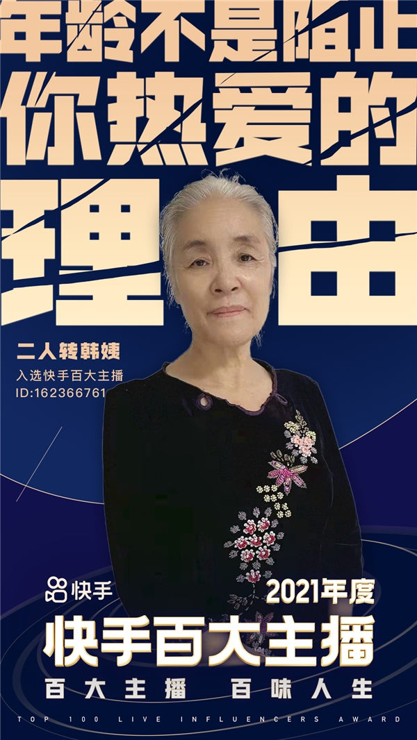 憑借突出的表現(xiàn)力、內(nèi)容力、凝聚力,韓姨在近期的快手主播評估中脫穎而出,入圍2021年度“快手百大主播”。對韓姨而言,獲評“百大”不僅是數(shù)十年以來自己二人轉(zhuǎn)夢想的里程碑,也是一個新起點,帶著自己喜愛的二人轉(zhuǎn),韓姨還以“百大主播”的全新身份登上了“快手一千零一夜?2021百大主播晚會”的舞臺,照亮更多人的夢想。談及未來,韓姨表示會將努力的方向從個人夢想向?qū)W員們傾斜,“也希望更多人能夠通過快手了解二人轉(zhuǎn)藝術(shù),加入傳承非物質(zhì)文化遺產(chǎn)的陣營中。”
