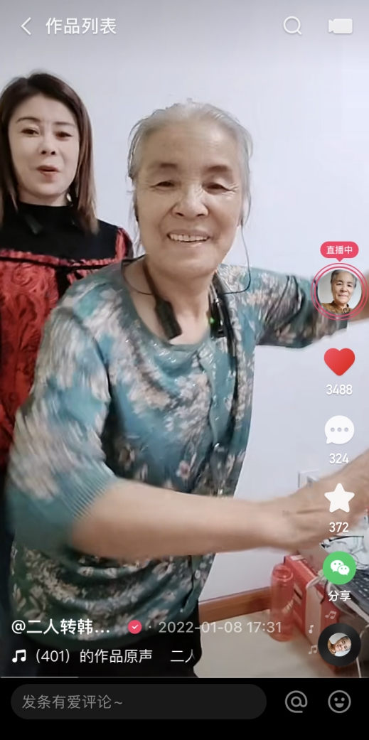 “親愛的老鐵們吶,今天給大家唱一段《繡云間》。”快手上,今年71歲高齡的韓姨(快手ID:hanyi666777888)向粉絲們打了個招呼,聲音響亮干脆,然后跟著音樂隨意搖擺著身子,唱出東北二人轉(zhuǎn)的豪放“味兒”。