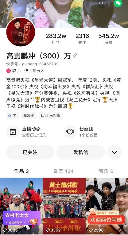 現在的高貴鵬已經在快手擁有283.3萬粉絲,從記錄生活到爆火出圈,一切的轉變都要從2019年的一條音樂MV說起,“那時我在外演出遇見了不少音樂前輩,其中就有云飛老師,2019年我和云飛老師一起錄制了一個陜北民歌的MV,我剪成短視頻發在快手后,一下漲了5、6萬粉絲。”