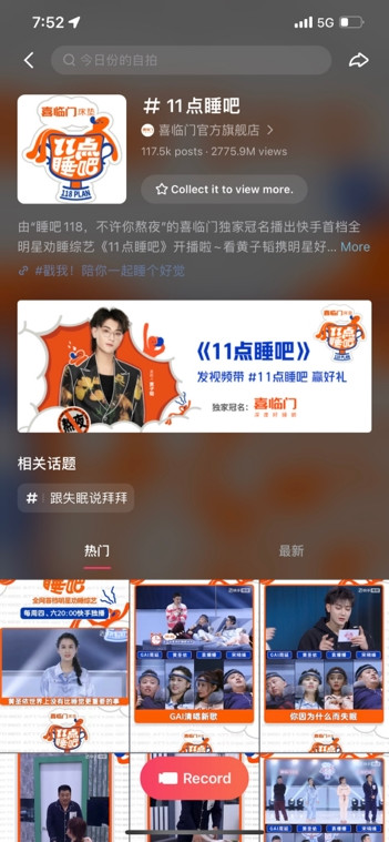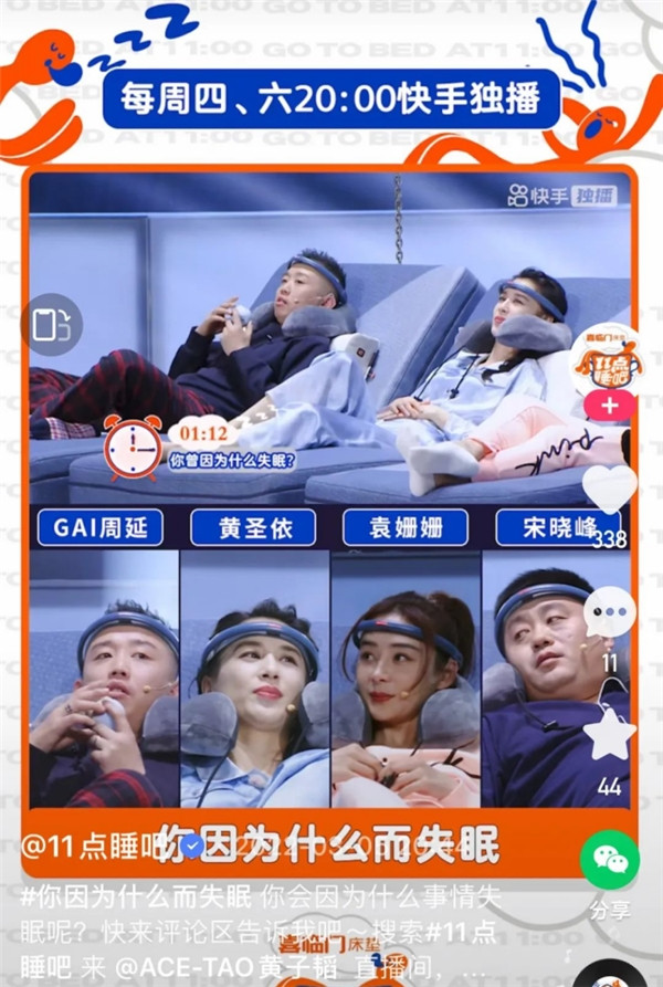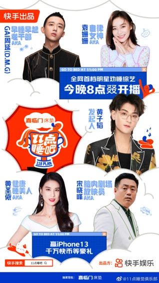 順應(yīng)用戶(hù)洞察,快手娛樂(lè)制作了全網(wǎng)首檔明星勸睡綜藝《11點(diǎn)睡吧》,喊出“high什么high,早點(diǎn)睡”口號(hào),聚焦睡眠健康,推出明星睡眠挑戰(zhàn)。節(jié)目中,黃子韜作為發(fā)起人,邀請(qǐng)16位藝人嘉賓,與8位快手達(dá)人組成“想睡挑戰(zhàn)團(tuán)”,角逐“大睡神杯”。