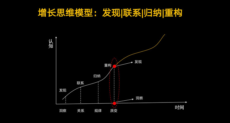 這里所說的“發(fā)現(xiàn)”,比如我們平時(shí)經(jīng)??吹胶芏啾硐蟮臇|西,我們要做的一件事情就是洞察這些表象背后更本質(zhì)的關(guān)系、關(guān)聯(lián)的內(nèi)容。其實(shí)在這個(gè)中間就會(huì)有很多關(guān)系,包括一些因果關(guān)系或者歸因關(guān)系,這時(shí)我們就要去做分析,做歸納做總結(jié),最重要是找一些規(guī)律性和共性層面的思考,把這個(gè)規(guī)律給提煉出來之后,我們就會(huì)得到一些方法論,其實(shí)在規(guī)律這一塊就可以理解成一些偏方法層面的內(nèi)容。到最后,你可能對(duì)很多問題的認(rèn)知和理解提升了很多,那你就會(huì)進(jìn)入下一個(gè)階段,因?yàn)槿说恼J(rèn)知或者學(xué)習(xí)能力都是在不斷的提升。這些就是屬于思維層面的提升。