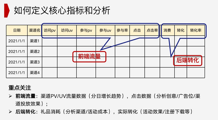 其實上面的所有的數(shù)據(jù)分析內(nèi)容大概可以整理成兩個核心環(huán)節(jié),一個是關(guān)于前端流量,第二個是關(guān)于后端轉(zhuǎn)化。當我們知道了前端的流量數(shù)據(jù),再結(jié)合后端轉(zhuǎn)化數(shù)據(jù)。我們就可以分析出來一個活動的獲客成本是怎么樣的,整體ROI如何。
