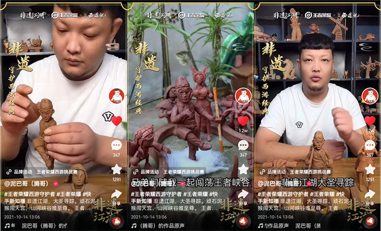 在快手非遺江湖聯合王者榮耀發起的“王者榮耀西游守護者”活動中,泥巴哥用泥巴捏了一個齊天大圣,將泥塑文化和游戲內容緊密聯系起來。配著《西游記》的經典背景音樂,泥巴做的齊天大圣破土而出,乘著筋斗云來到王者榮耀的水晶旁,帶著兄弟們一起闖蕩王者峽谷。“捏個泥娃娃,翻個筋斗云,來去無影動乾坤”,栩栩如生的泥塑生動展現了西游文化中的修煉和堅守。