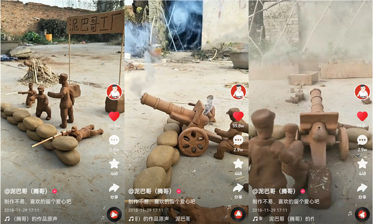 作為非專業的視頻創作者,泥巴哥從零開始,一步步摸索。在翻拍《亮劍》的第一個視頻中,他用泥巴演繹了一段李云龍救秀芹的劇情,泥塑高度還原場景,并完美對應電視劇的對白原聲。短短幾十秒動畫的背后,從設計劇情到制作泥塑,再到拍攝、剪輯和配音,泥巴哥都費盡了心思。