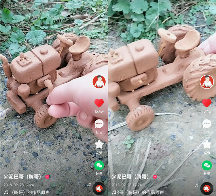 抱著試一試、玩一玩的心態,泥巴哥在快手上發布了第一條泥塑短視頻。作為土生土長的農村孩子,泥巴哥捏了自己從小就常接觸的拖拉機,并拍攝了一段推著泥巴拖拉機向前開的視頻,還自己配上了拖拉機發動的聲音“騰騰騰騰騰”。