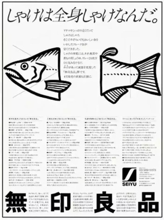 對(duì)此,無(wú)印良品創(chuàng)始人之一的田中一光先生提出了“鮭魚(yú)就是一整條”的理念,以呼吁大家不要浪費(fèi)大自然的饋贈(zèng)。在這樣的理念下,無(wú)印良品推出了使用整條鮭魚(yú)制作而成的鮭魚(yú)罐頭,宣傳這一理念的主題海報(bào)在報(bào)紙上刊登后,也引發(fā)了大家對(duì)食品浪費(fèi)問(wèn)題的關(guān)注。