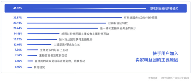 根據(jù)《快手C端用戶信任心智調(diào)研》,在快手,有41.32%的人因為“想收到主播開播通知”而加入經(jīng)營者的粉絲團。78.59%的私域經(jīng)營者借助平臺的私域經(jīng)營工具賺到錢。總體上,快手私域貢獻了70%的電商交易額、80%的直播打賞金額。