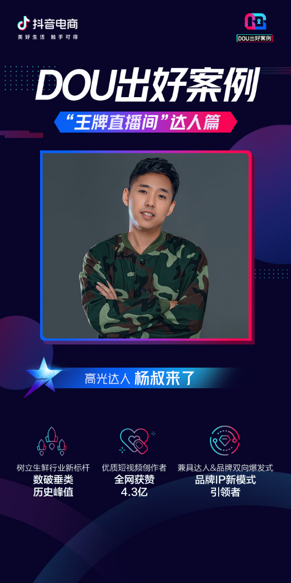 日常發布內容商業部分極少的抖音垂直類賬號“楊叔來了”,同時也是抖品牌“海洋演義”的主理人。主做內容人設的“楊叔來了”深耕生鮮領域,樸實逗趣,充滿生活氣。抖音粉絲量1652萬,獲贊量3.2億;全平臺粉絲量2359萬,獲贊量4.3億,真正把“好生鮮”,做成了“大生意”。