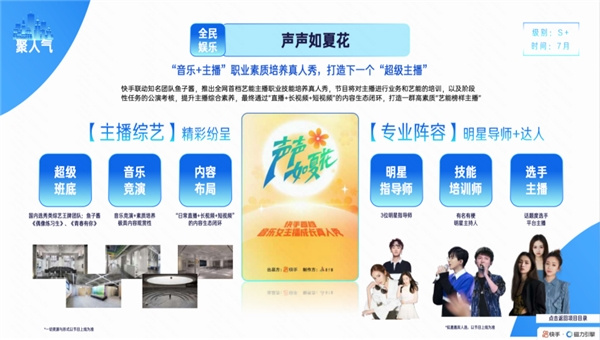 在娛樂(lè)主場(chǎng),除了多個(gè)重磅IP第二季外,快手也將推出全網(wǎng)首檔藝能主播職業(yè)技能培養(yǎng)真人秀《聲聲如夏花》,通過(guò)多元商業(yè)合作方式,滿足廣告主品效合一需求;同時(shí)將在香港回歸25周年之際,攜手TVB旗下IP推出綜藝《開(kāi)拍吧,蘭桂坊》,以豪華港星陣容再掀話題熱度新高,以頭部達(dá)人全面釋放私域影響力,以站內(nèi)二創(chuàng)互動(dòng)活動(dòng)激發(fā)全民共創(chuàng)熱潮。