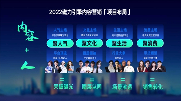 2022年,磁力引擎將圍繞“內(nèi)容+人”,推出多領(lǐng)域的重量級(jí)IP及覆蓋全年的豐富活動(dòng),打造人氣、文化、生活、消費(fèi)四大內(nèi)容營(yíng)銷(xiāo)新主場(chǎng),助力廣告主聚人氣、聚文化、聚生活、聚消費(fèi),實(shí)現(xiàn)“品效銷(xiāo)”三贏。