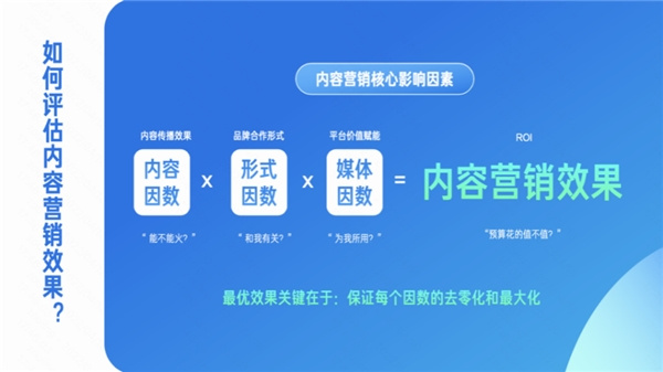 對(duì)于品牌而言,如何評(píng)估內(nèi)容營(yíng)銷(xiāo)效果?磁力引擎根據(jù)內(nèi)容營(yíng)銷(xiāo)三大核心影響因素——內(nèi)容傳播效果、品牌合作形式、平臺(tái)價(jià)值賦能,提出內(nèi)容營(yíng)銷(xiāo)效果解題公式“內(nèi)容因數(shù)×形式因數(shù)×媒體因數(shù)=內(nèi)容營(yíng)銷(xiāo)效果(ROI)”。廣告主想要實(shí)現(xiàn)內(nèi)容營(yíng)銷(xiāo)最優(yōu)效果的關(guān)鍵,就在于保證每個(gè)因數(shù)的去零化和最大化。
