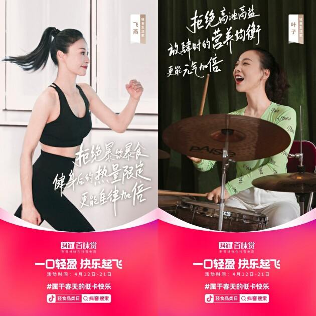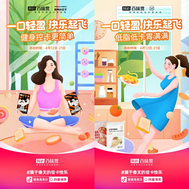 抖in百味賞聯合品牌發布活動主題海報,共同傳遞“健康輕食正當紅”的熱度,通過營造氛圍吸引品牌已有粉絲。而在海報創意上,抖in百味賞分別圍繞健身人群、吃貨人群、健康飲食人群的差異化痛點,結合品牌特色定制場景與文案,放大輕食生活吸引力。多元化、典型化的輕食場景和人群展示,使用戶迅速對輕食品類日形成認知。