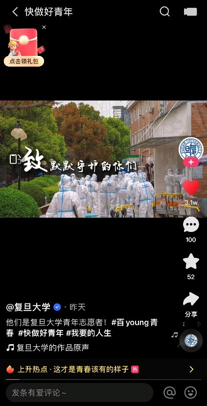 青年是標志時代的最靈敏的晴雨表。特殊時期,復旦大學的青年志愿者們化身“大白”和“小藍”,戴上口罩,穿上防護服,放棄自己午休和吃飯的時間,為同學們送上三餐和物資。“復旦大學”快手賬號分享本校志愿者日常點滴收獲3.2萬點贊,網友紛紛在評論區送上自己的加油和祝福。