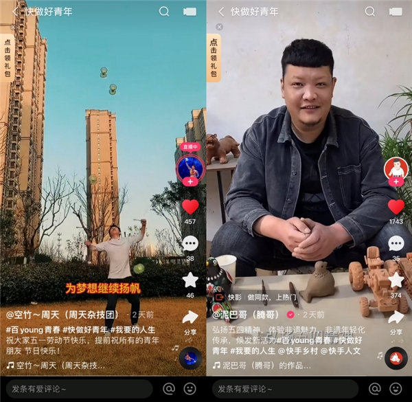 奉獻無聲音,熱愛無止盡。“泥巴哥騰哥”的青春故事與非遺泥塑密不可分,五四精神經由他的巧手與創意,具象為一個個栩栩如生的泥塑作品,而他也通過自身努力讓非遺年輕化傳承再次煥發新活力。青年雜技演員周天則用朝氣蓬勃的空竹表演展現青年姿態,雖然在特殊時期暫時失去舞臺和掌聲,但他選擇繼續通過快手傳遞空竹魅力,“不管身在哪個行業,為了家庭和社會,我們一定要頂住!”
