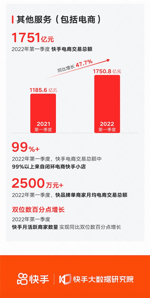 一季度,快手電商交易總額(GMV)取得47.7%的同比增長,規(guī)模達(dá)到1751億元。伴隨著電商生態(tài)自建的推進(jìn),快手小店對平臺GMV的貢獻(xiàn)已達(dá)到99%以上。受電商業(yè)務(wù)發(fā)展推動,其他服務(wù)板塊收入同比增長54.6%至19億元。