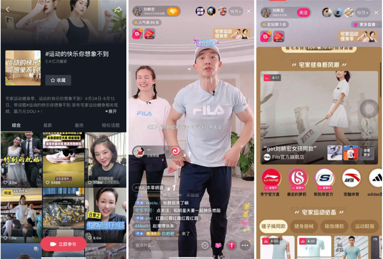 憑優勢高點起跳,「抖in新風潮 宅家運動健身季」在營銷上持續引導宅家健身話題孵化,通過聚焦健身來精準吸引用戶關注,推動宅家健身話題的進一步發酵。李若彤、張繼科、潘曉婷等明星聯合共創健身內容沖榜,配合相關商家、達人的種草短視頻,助推宅家健身認知網絡的再次豐滿,并向主會場和直播間引流。