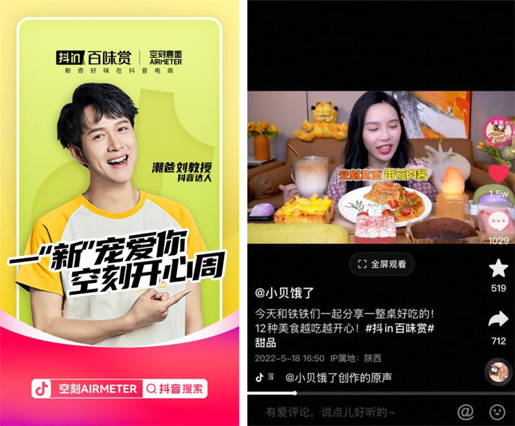 比如,在空刻意面的空刻開心周活動中,抖in百味賞推薦品牌邀請多位抖音上的頭部達人合作,潮爸劉教授加入品牌直播間助陣,以主播人氣帶動品牌銷量;cici888、小貝餓了分別聯動了直播專場和短視頻種草等,多維度助力空刻意面最終實現活動時間總GMV超1400w。