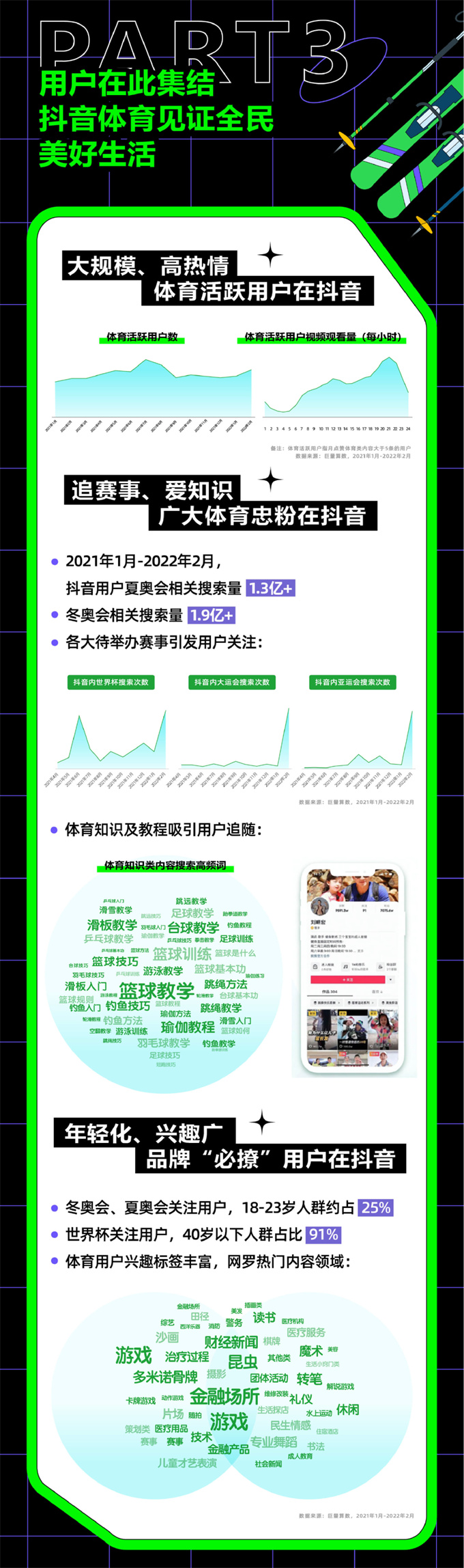 在運(yùn)動(dòng)員和達(dá)人們的帶領(lǐng)下,越來(lái)越多體育用戶被吸引而來(lái),在抖音看體育、討論體育、記錄體育生活?!栋灼?shū)》顯示,在2021年1月至2022年2月期間,共有1.2億+抖音用戶在抖音發(fā)布體育類(lèi)視頻,記錄美好的體育生活,站內(nèi)體育類(lèi)興趣用戶高達(dá)4.7億+。