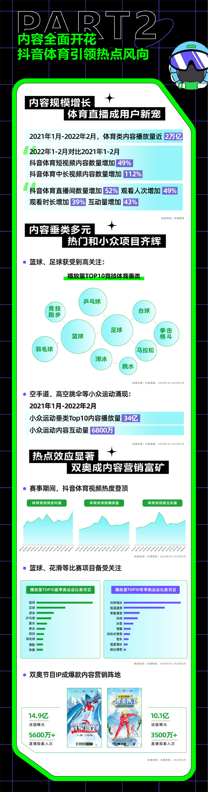 《白皮書(shū)》顯示,2022年1-2月對(duì)比2021年1-2月,抖音體育類(lèi)內(nèi)容播放量共計(jì)約2萬(wàn)億次,分布在各類(lèi)賽事、競(jìng)技運(yùn)動(dòng)、健身等行業(yè)。