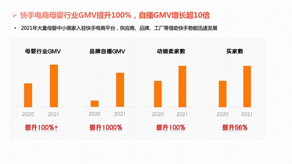 “母嬰行業(yè)選品會(huì)”上,快手電商母嬰行業(yè)運(yùn)營專家陳元公布了2022年度母嬰電商行業(yè)的最新趨勢。據(jù)介紹,2022年第一季度,快手應(yīng)用平均日活躍用戶達(dá)3.46億,交易總額同比增長47.7%。這一消費(fèi)力同樣體現(xiàn)在母嬰電商行業(yè),2021年快手電商母嬰行業(yè)GMV和動(dòng)銷賣家數(shù)均提升100%,品牌自播GMV提升1000%。童裝童鞋、母嬰食品、尿褲濕巾、嬰幼洗護(hù)、兒童玩具母嬰五大類目增速明顯,商品件數(shù)最大環(huán)比上升584.8%。