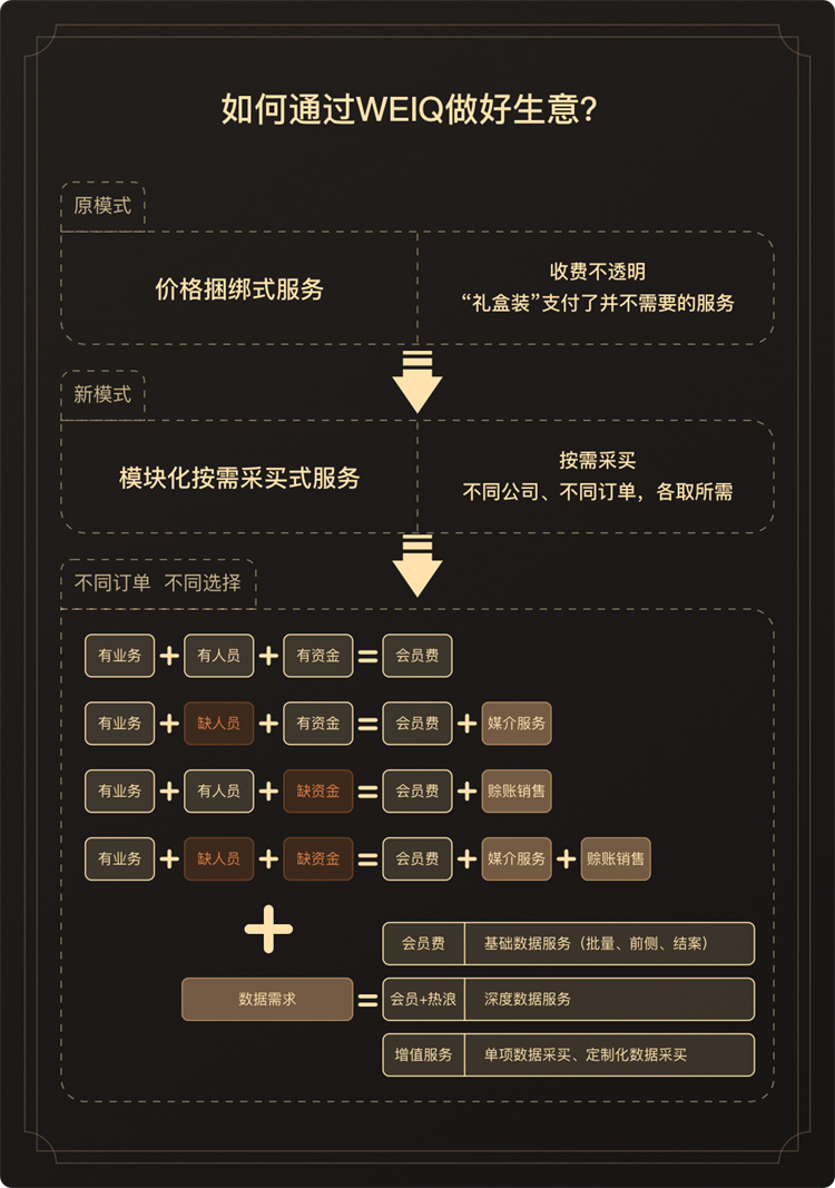 在資金方面,WEIQ版本升級后支持服務商先投后付,以客戶為中心,以投放為首要目的,可以幫助服務商高效投放,并緩解項目集中爆發,項目預算臨時增加,現金流與資金周轉超出預期等緊急狀況,幫助其會員提高運轉效率。